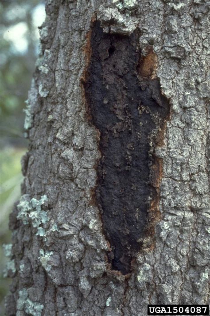 Many mature trees, including elms, oak, tulip poplar, and maple, exhibit large light or dark vertical streaks on their trunks. Wetwood affected oak. These vertical streaks result from a slimy liquid oozing out of cracks or wounds and running down the bark called ‘slime flux’.