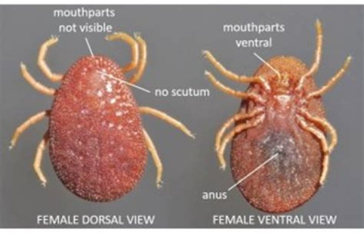 Both male and female deer ticks have flat, oval bodies, and are not hard-shelled. Female deer ticks are orangish brown in color except for their legs, mouthparts, and scutum (shield). Unengorged, their abdomen is a dark reddish-brown color but becomes darker after feeding on a host.