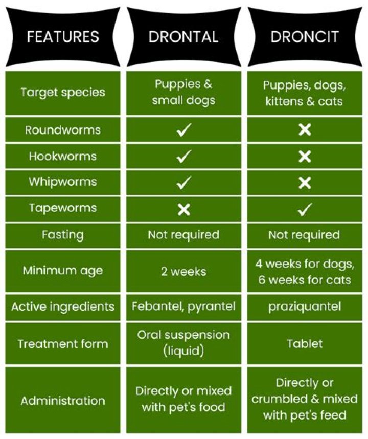 Is Droncit the same as drontal?Answer: Droncit is a tape wormer only. Drontal treats tape worm and round worm. Wormers should be given based on what flea treatment is administered.