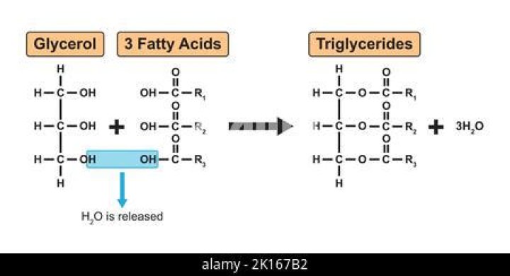 Like carbohydrates, triglycerides are formed by a condensation reaction and broken down by a hydrolysis reaction. A hydrogen atom on the glycerol molecule bonds to a hydroxyl (-OH) group in the fatty acid, releasing a molecule of water. … A molecule of glycerol and 3 fatty acids.