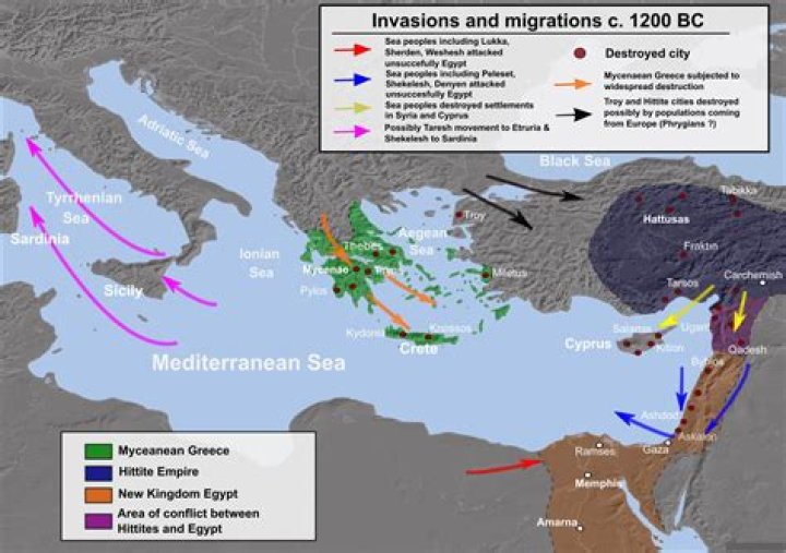 Although the archaeological inscriptions do not include reference to a migration, the Sea Peoples are conjectured to have sailed around the eastern Mediterranean and invaded Anatolia, Syria, Phoenicia, Canaan, Cyprus, and Egypt toward the end of the Bronze Age.