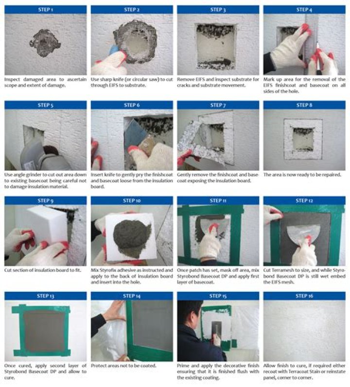 The damage to the EIFS system may be the result of intentional vandalism, unintentional damage resulting from traffic, landscaping activities etc, or weather phenomenon such as blowing debris, heavy hail etc. Holes or other damage is easily repaired with Terraco Styrobond HB DP – less than 50 mm in diameter.