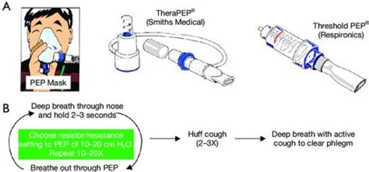 In positive expiratory pressure (PEP), a person breathes through a mask or a handheld mouthpiece. PEP devices allow air to flow freely as you breathe in, but not when you breathe out. You must breathe out harder against the resistance.