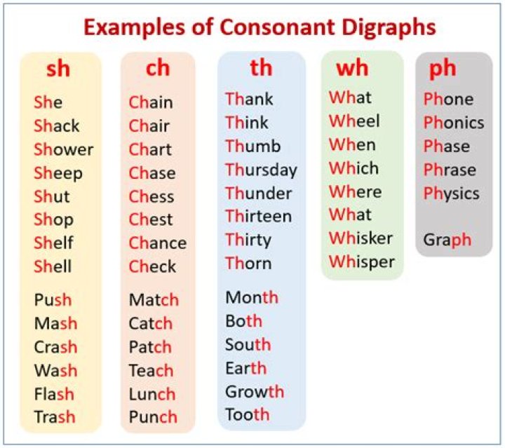 Like blends, consonant digraphs can be found in any position of the word. Some common consonant diagraphs are wh, ch, sh, th (voiced and unvoiced). Some phonics systems consider the letter combinations of kn, gn, wr, ck and ng to be consonant diagraphs.