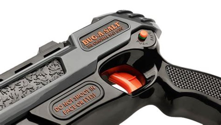 The Bug-A-Salt device uses granular table salt as non-toxic projectiles to kill insects. The plastic gun is designed to spray up to 80 discharges of salt, which forms a conical spread pattern, similar to the blast pattern from a shotgun.