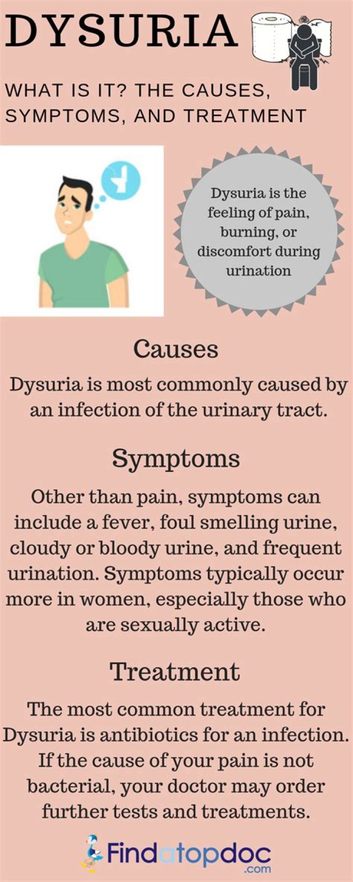 Dysuria means you feel pain or a burning sensation when you pee (urinate). Men and women of any age can experience dysuria, but it’s more common in women. Urinary tract infections are commonly associated with dysuria.