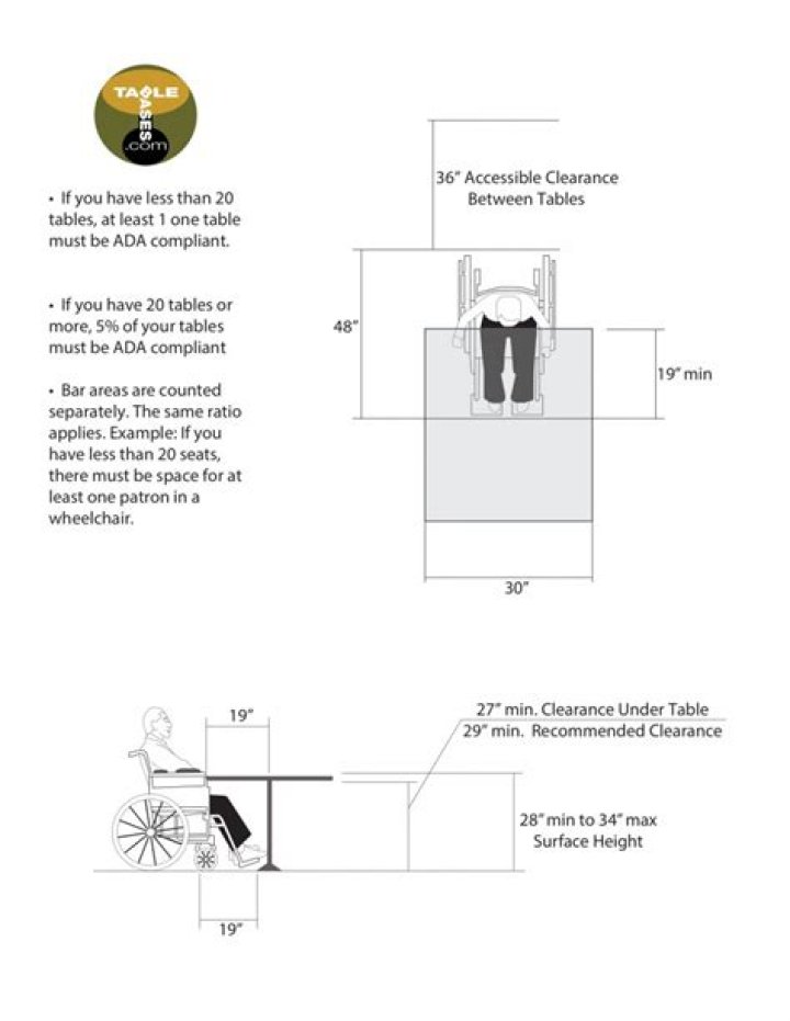 5% of the tables (or at least one if you have less than 20 tables) in your establishment must be ADA Compliant tables. A floor area of 30″ by 48″ should be cleared to accommodate wheelchair seating at a table or counter.How many ADA tables do I need?