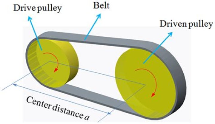 Belt Drives are a type of frictional drives used for transmitting powers from one shaft to another by means of pulleys which rotate at the same speed or at the different speed. A belt drive is shown in the figure. It consists of two pulleys over which an endless belt it passed over them.
