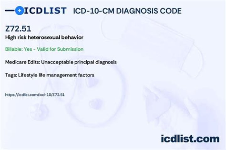 ICD-10 code Z72. 51 for High risk heterosexual behavior is a medical classification as listed by WHO under the range – Factors influencing health status and contact with health services .