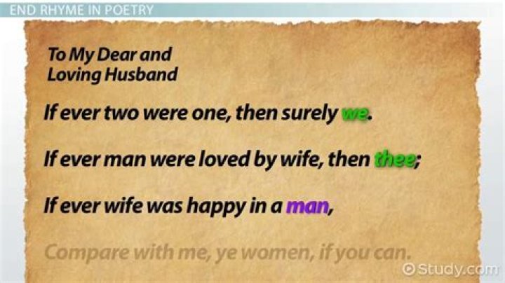 End rhyme is defined as “when a poem has lines ending with words that sound the same.” End rhyme is also called tail rhyme or terminal rhyme. It is one of many types of rhyme. Two or more lines of the poem have to rhyme for it to be considered end rhyme, but they don’t have to be consecutive lines.