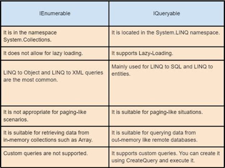 IEnumerable is best to query data from in-memory collections like List, Array, etc. While query data from a database, IEnumerable execute a select query on the server side, load data in-memory on a client-side and then filter data. IEnumerable is suitable for LINQ to Object and LINQ to XML queries.