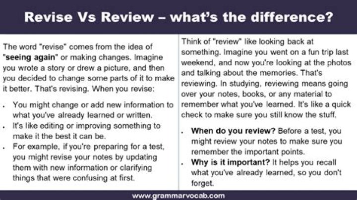 To revise means to alter or improve a preliminary draft of something, usually a text. When you want your writing to be really great, you must revise it several times until it is perfect. The word revise sounds like the related word revisit, and revising a piece of work does in fact require revisiting it.How do you revise something?