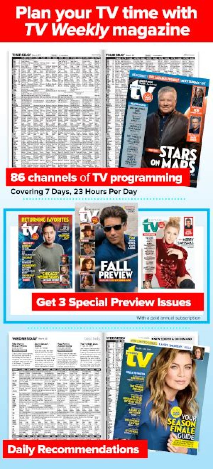 TV Guide Magazine is a bi-weekly American magazine that provides television program listings information as well as television-related news, celebrity interviews and gossip, film reviews, crossword puzzles, and, in some issues, horoscopes.