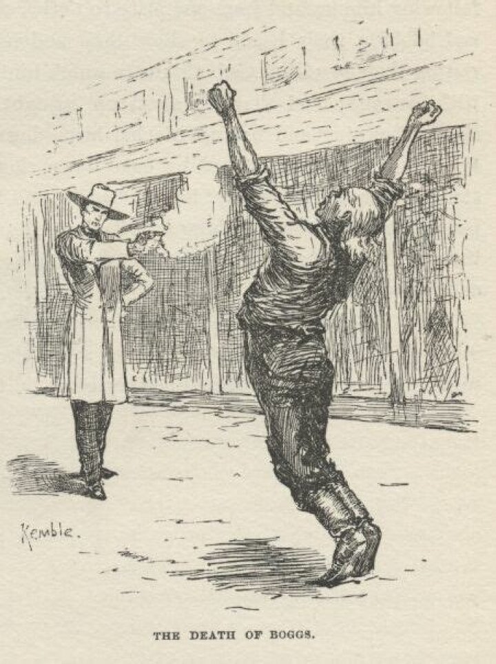 A man runs to fetch Boggs’ daughter. About five or ten minutes later, Huck, having walked down the street, sees Boggs, no longer on his horse, nervous-looking. Sherburn calls out Bogg’s name, and, just as Bogg’s daughter arrives on the scene, Sherburn shoots Bogg to death.